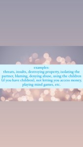 3. Examples: Threats, Insults, Destroying Property, Isolating the Partner, Blaming, Denying Abuse, Using the Children (if you have children), Not Letting You Access Money, Playing Mind Games, etc.
